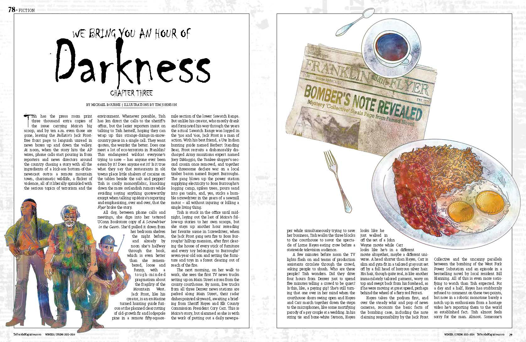 Equally as cool, Telluride magazine published a chapter of We Bring You and Hour of Darkness in its winter issue, along with some killer illustrations by Tim Johnson.
