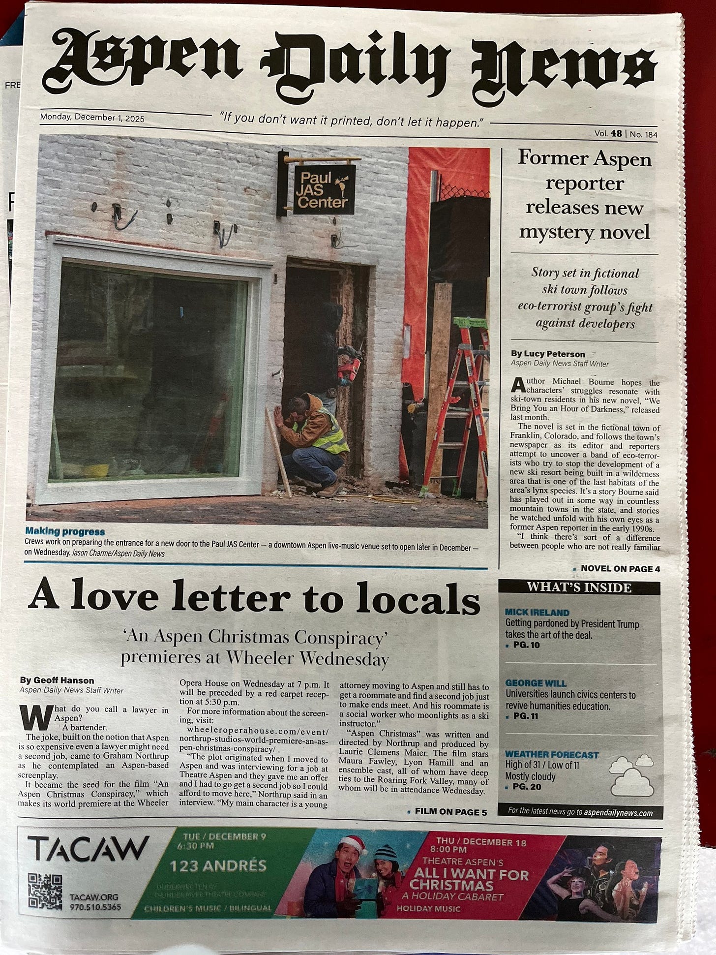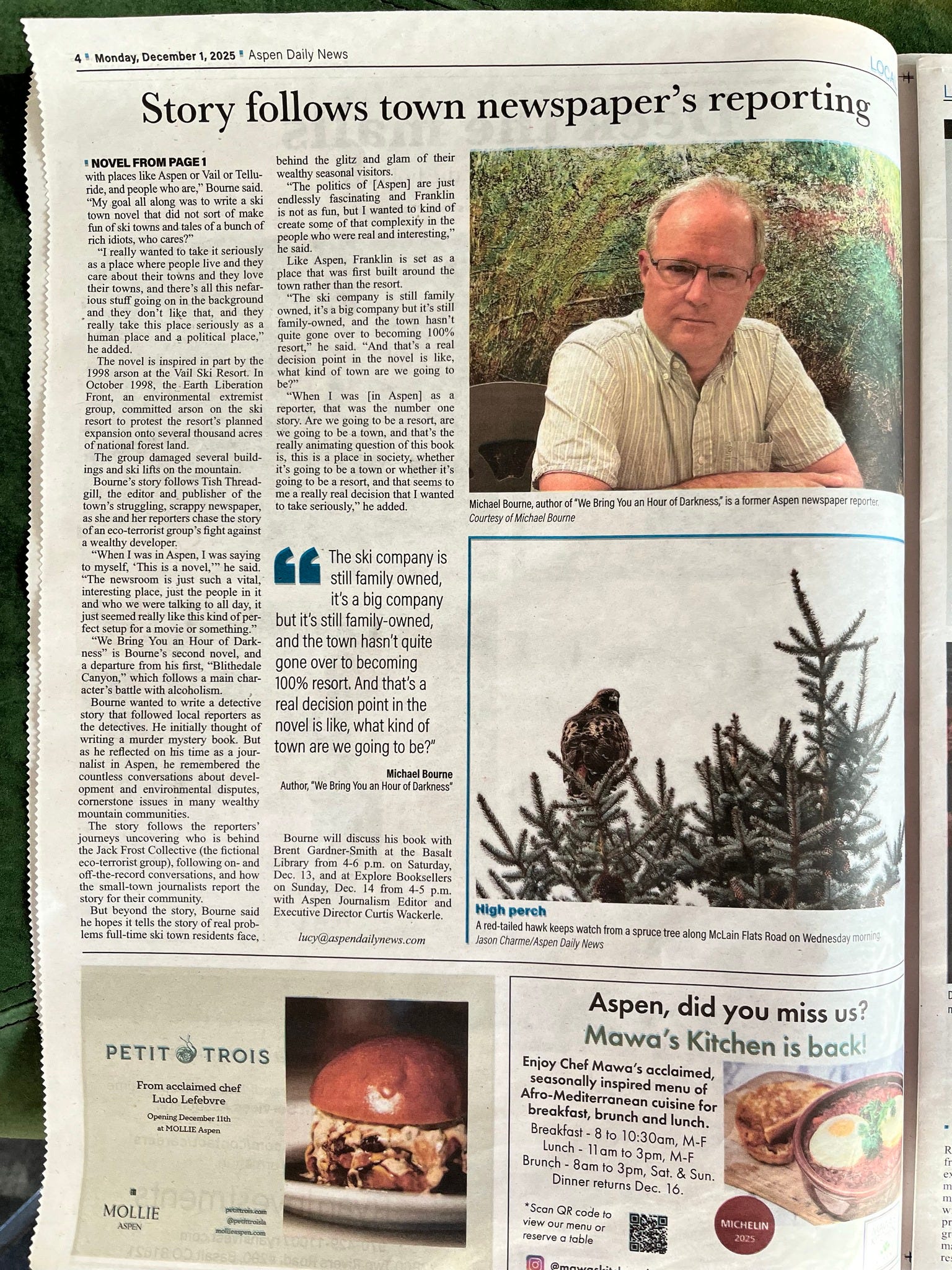 In my early twenties, I was a reporter at the Aspen Daily News, an experience that helped inspire my second novel, much of which is set in the newsroom of a ski-town newspaper. The Franklin Flyer of the novel is not the Aspen Daily News - among many other things, the Daily News did not have a woman as its editor and publisher - but it’s safe to say that if I hadn’t spent those two and a half years in Aspen, my second novel would have been about something else.
