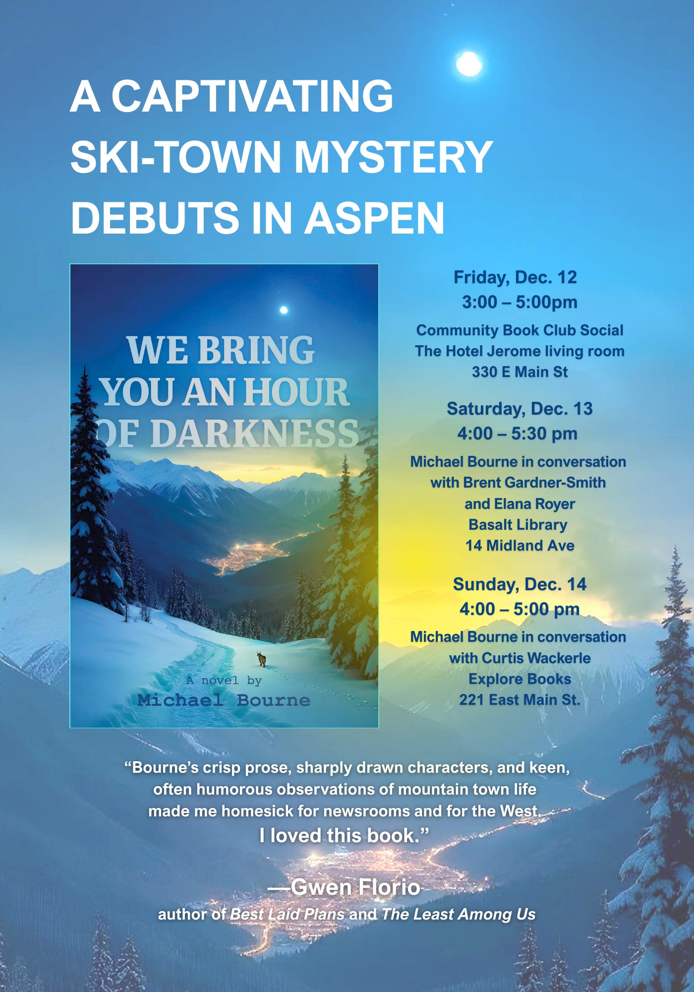 On Tuesday, I fly to Colorado to kick off a weeklong tour of ski towns, winding up with several events in Aspen. This is an obvious way to support a novel set in a ski town, but for me it’s also a chance to return to the wellspring of We Bring You an Hour of Darkness.