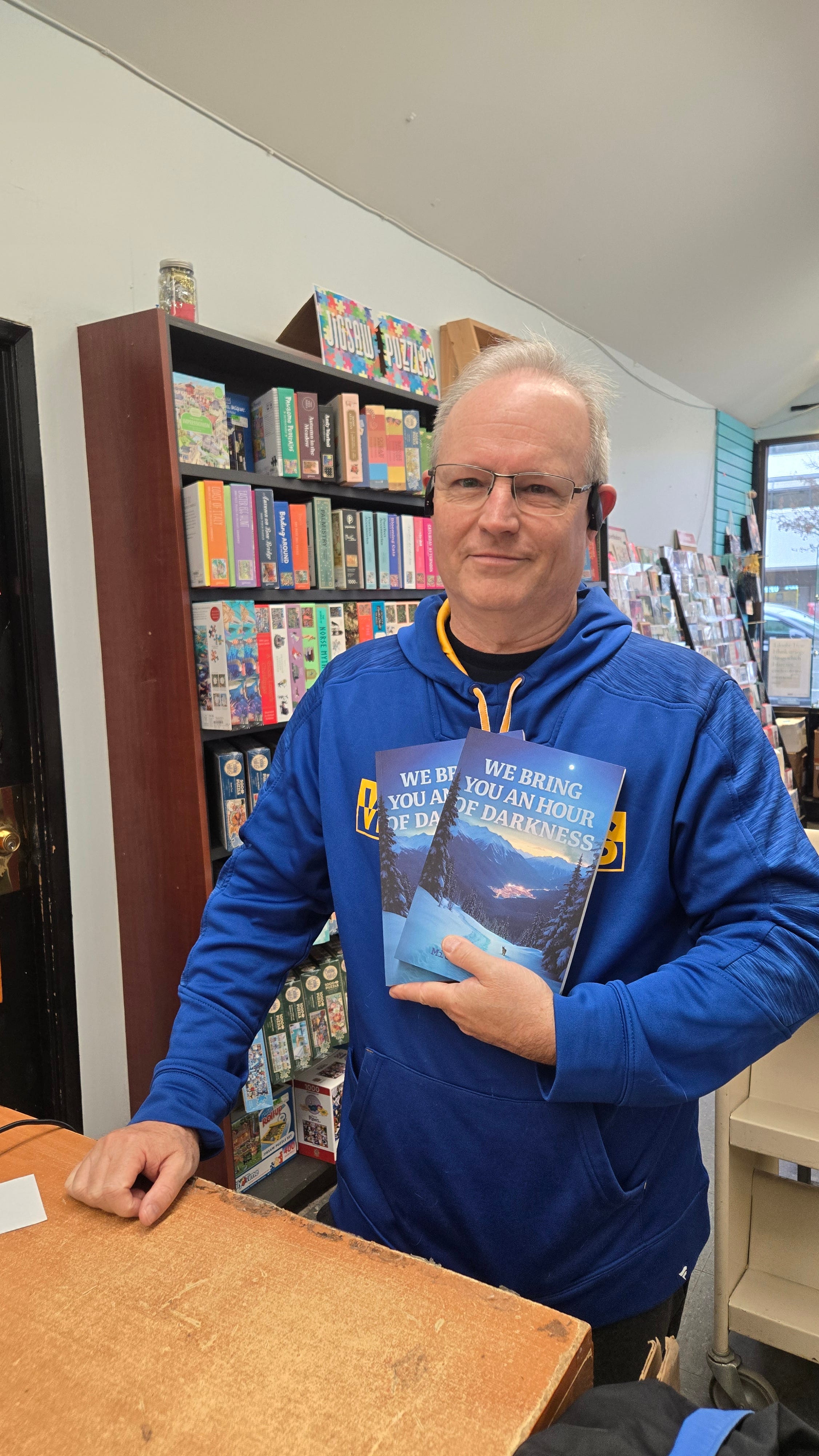 Here I am earlier today, at my local bookstore, the Broadway branch of Book Warehouse in Vancouver, signing the two copies they had on the shelves.